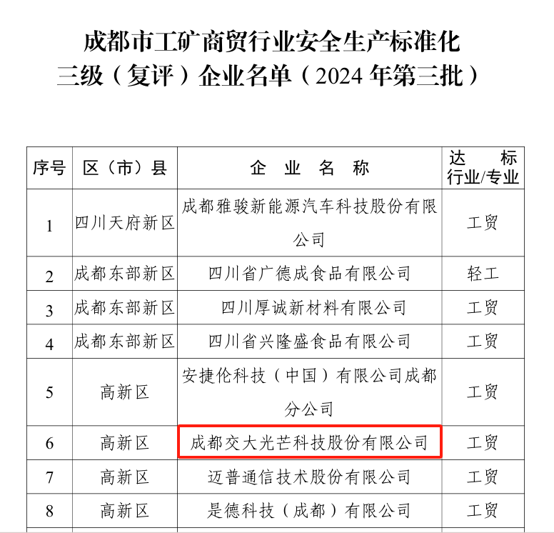 2024Äê9Ô£¬³É¶¼»áÓ¦¼±¾ÖÐû²¼¡¶¹ØÓÚÐû²¼³É¶¼»á¹¤¿óÉÌóÐÐÒµÇå¾²Éú²ú±ê×¼»¯Èý¼¶£¨¸´ÆÀ£©ÆóÒµÃûµ¥£¨2024ÄêµÚÈýÅú£©µÄ֪ͨ¡·£¬½»´ó¹âÏßͨ¹ýÇå¾²Éú²ú±ê×¼»¯Èý¼¶´ï±ê¸´ÆÀ ¡£